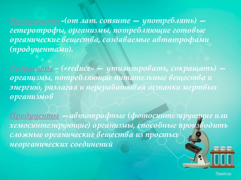 Слайд 3Консументы -(от лат. consumе — употреблять) — гетеротрофы, организмы, потребляющие готовые