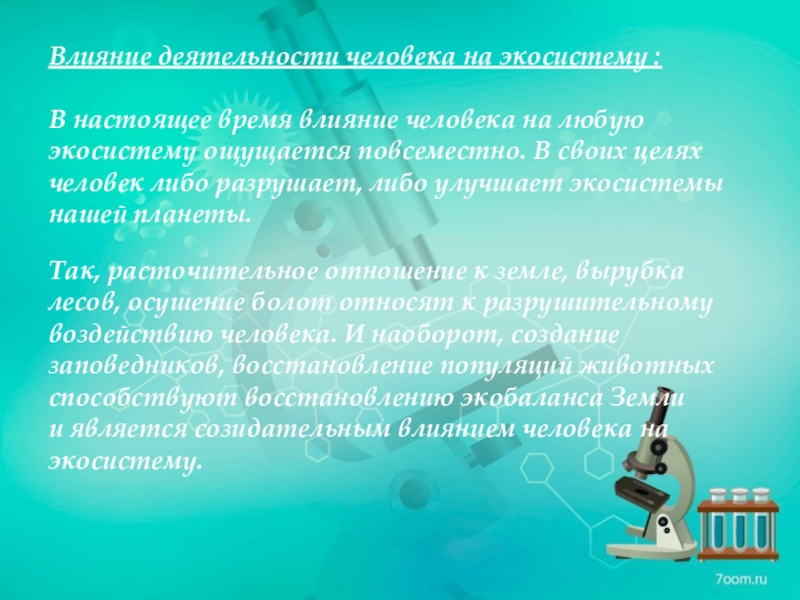 любую экосистему ощущается повсеместно. В своих целях человек либо разрушает, либо улучшает экосистемы нашей планеты.