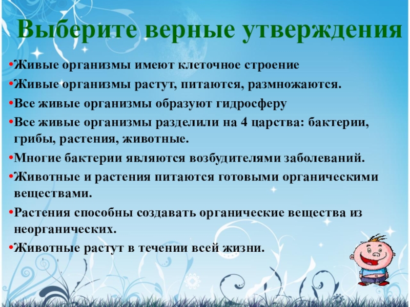 Выберите верные утвержденияЖивые организмы имеют клеточное строениеЖивые организмы растут, питаются, размножаются.Все живые организмы образуют гидросферуВсе живые организмы