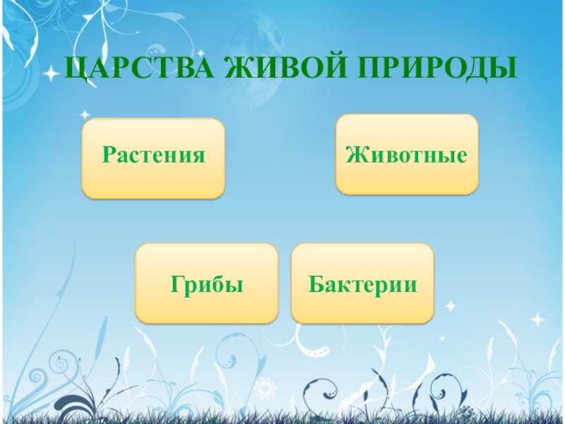 ЦАРСТВА ЖИВОЙ ПРИРОДЫРастенияЖивотныеБактерииГрибы