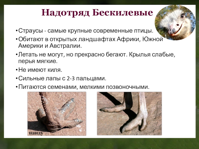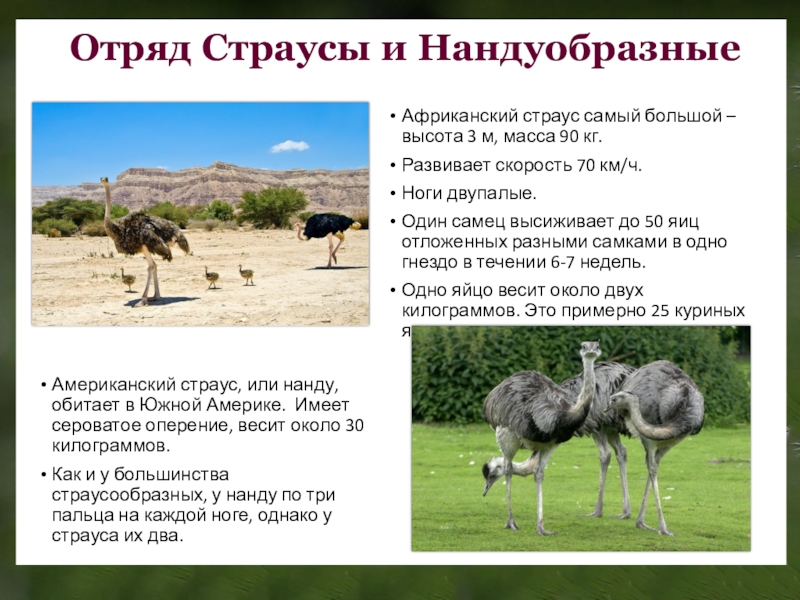 Американский страус, или нанду, обитает в Южной Америке. Имеет сероватое оперение, весит около 30 килограммов.