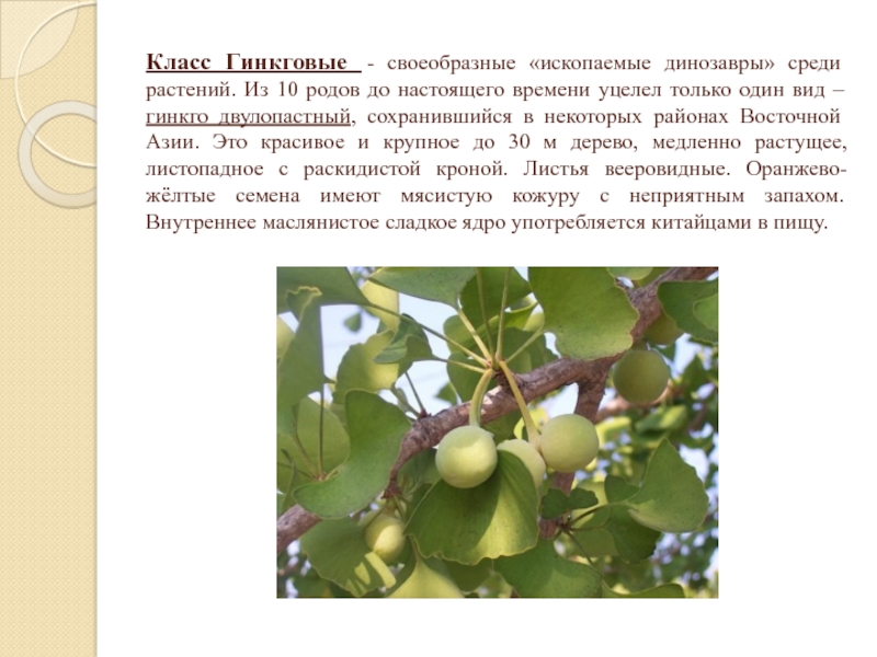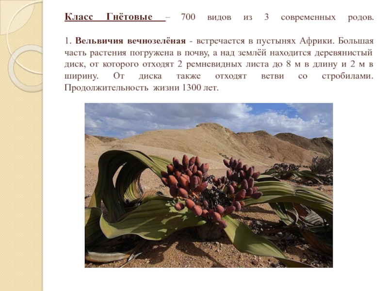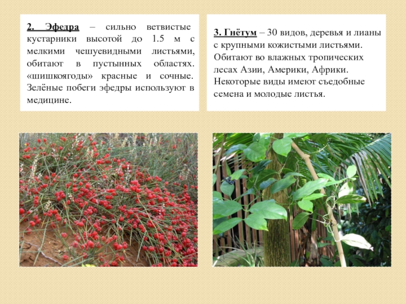 3. Гнётум – 30 видов, деревья и лианы с крупными кожистыми листьями. Обитают во влажных тропических лесах Азии, Америки, Африки. Некоторые виды имеют съедобные семена и молодые листья.
