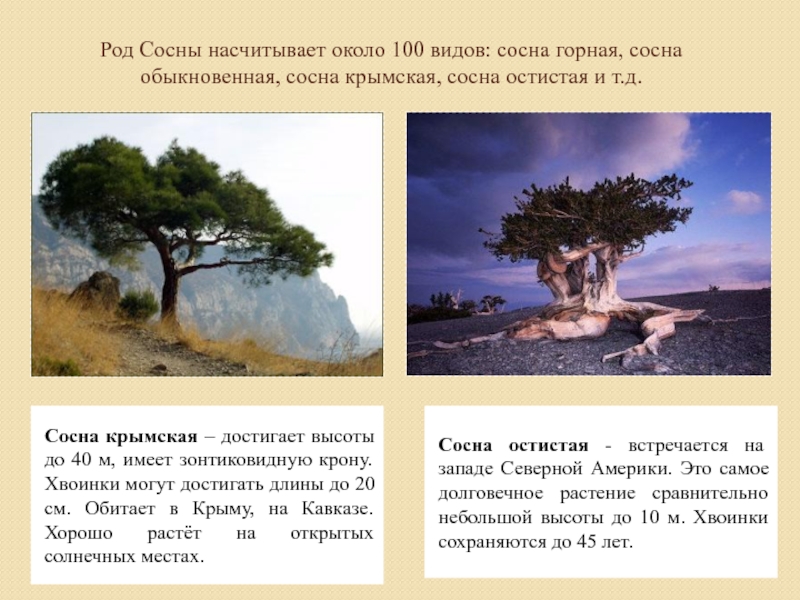 Род Сосны насчитывает около 100 видов: сосна горная, сосна обыкновенная, сосна крымская, сосна остистая и т.д.