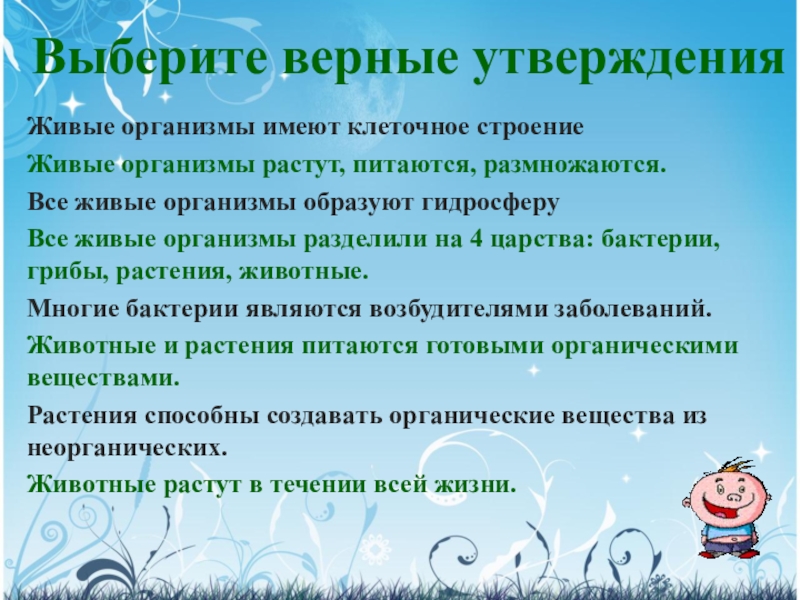 Выберите верные утвержденияЖивые организмы имеют клеточное строениеЖивые организмы растут, питаются, размножаются.Все живые организмы образуют гидросферуВсе живые организмы