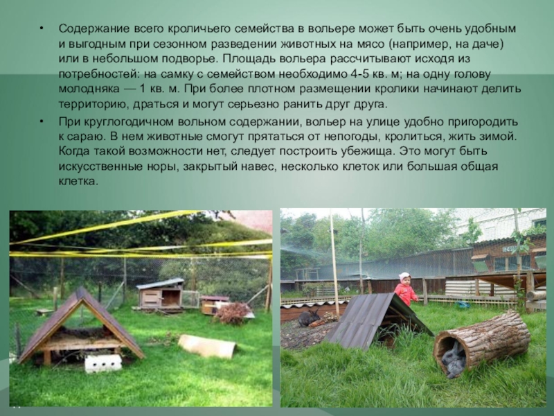 выгодным при сезонном разведении животных на мясо (например, на даче) или в небольшом подворье. Площадь вольера рассчитывают исходя из потребностей: на самку с семейством необходимо 4-5 кв. м; на одну голову молодняка — 1 кв. м. При более плотном размещении кролики начинают делить территорию, драться и могут серьезно ранить друг друга.