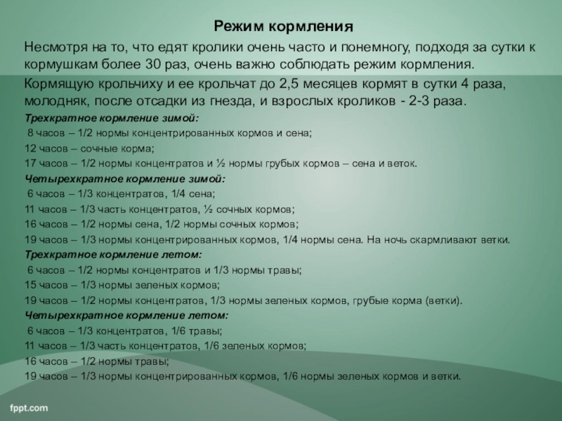 Кормящую крольчиху и ее крольчат до 2,5 месяцев кормят в сутки 4 раза, молодняк, после отсадки из гнезда, и взрослых кроликов - 2-3 раза.
