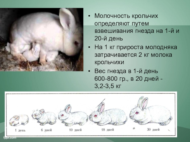 Слайд 8Молочность крольчих определяют путем взвешивания гнезда на 1-й и 20-й день
