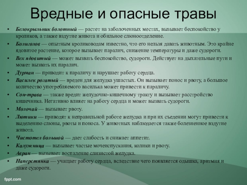 •дикорастущими травами и ветками деревьев, ядовитыми для кроликов;