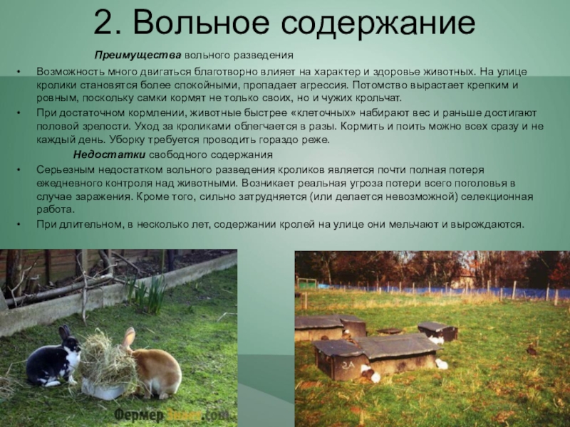 Серьезным недостатком вольного разведения кроликов является почти полная потеря ежедневного контроля над животными. Возникает реальная угроза потери всего поголовья в случае заражения. Кроме того, сильно затрудняется (или делается невозможной) селекционная работа.