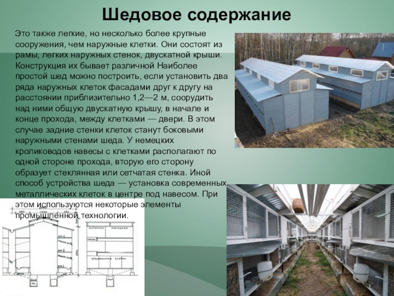 сооружения, чем наружные клетки. Они состоят из рамы, легких наружных стенок, двускатной крыши. Конструкция их бывает различной Наиболее простой шед можно построить, если установить два ряда наружных клеток фасадами друг к другу на расстоянии приблизительно 1,2—2 м, соорудить над ними общую двускатную крышу, в начале и конце прохода, между клетками — двери. В этом случае задние стенки клеток станут боковыми наружными стенами шеда. У немецких кролиководов навесы с клетками располагают по одной стороне прохода, вторую его сторону образует стеклянная или сетчатая стенка. Иной способ устройства шеда — установка современных металлических клеток в центре под навесом. При этом используются некоторые элементы промышленной технологии.