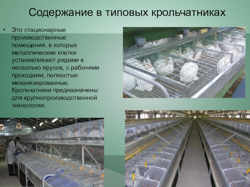 устанавливают рядами в несколько ярусов, с рабочими проходами, полностью механизированные. Крольчатники предназначены для крупнопроизводственной технологии.
