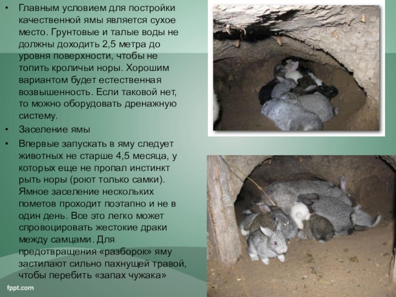 Впервые запускать в яму следует животных не старше 4,5 месяца, у которых еще не пропал инстинкт рыть норы (роют только самки). Ямное заселение нескольких пометов проходит поэтапно и не в один день. Все это легко может спровоцировать жестокие драки между самцами. Для предотвращения «разборок» яму застилают сильно пахнущей травой, чтобы перебить «запах чужака»