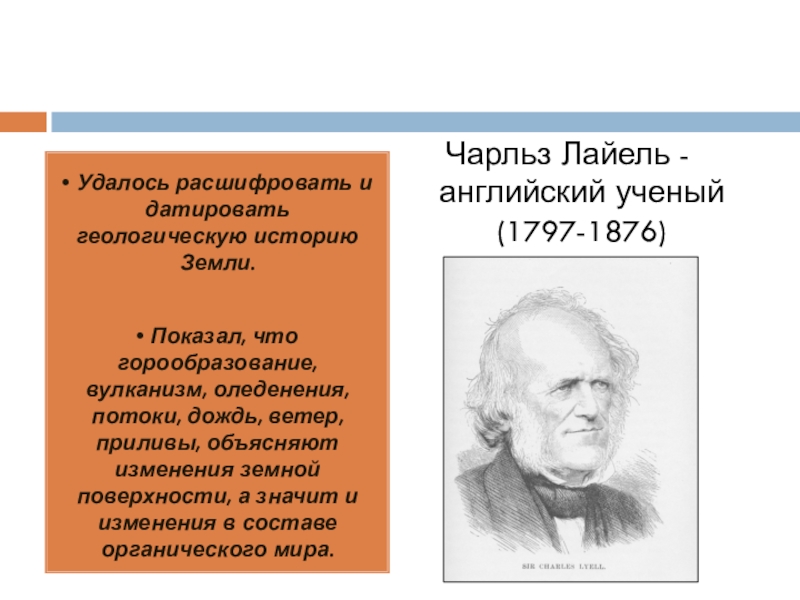 • Установил, что вымирание древних животных и растений могло быть следствием крупных катастроф геологического характера.