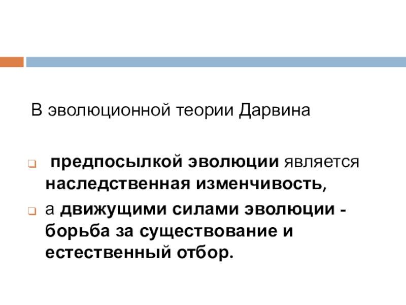 В своей теории основной движущей силой эволюции Дарвин назвал естественный отбор и неопределенную изменчивость.
