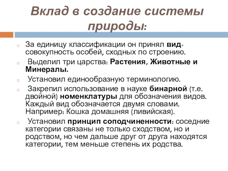 Закрепил использование в науке бинарной (т.е. двойной) номенклатуры для обозначения видов. Каждый вид обозначается двумя словами. Например: Кошка домашняя (ливийская).