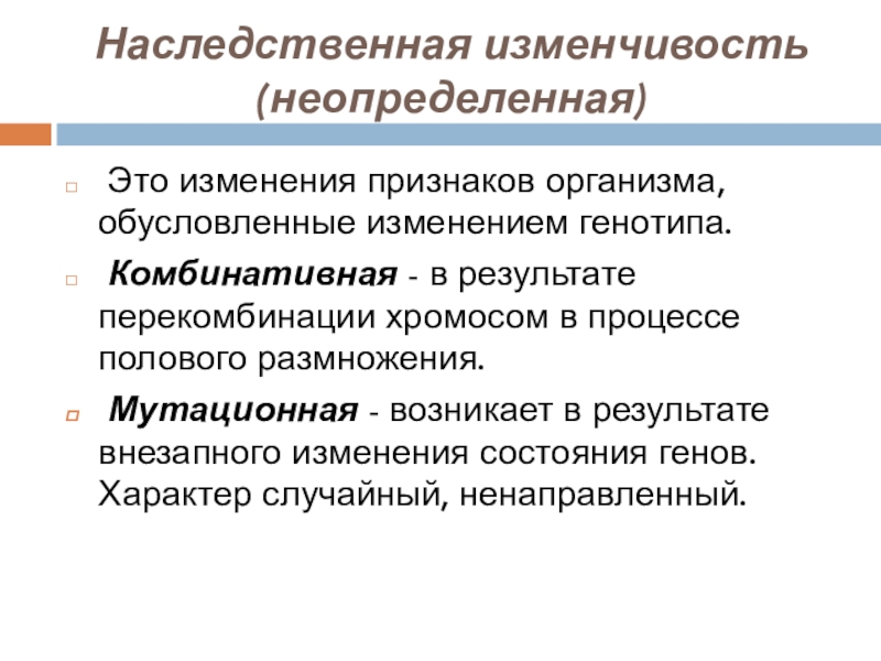 Мутационная - возникает в результате внезапного изменения состояния генов. Характер случайный, ненаправленный.