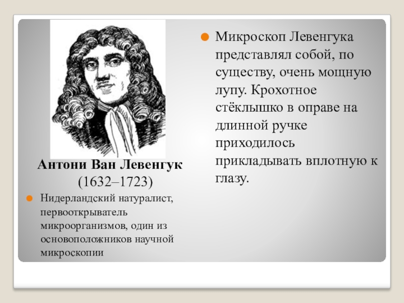 Микроскоп Левенгука представлял собой, по существу, очень мощную лупу. Крохотное стёклышко в оправе на длинной ручке приходилось прикладывать вплотную к глазу.
