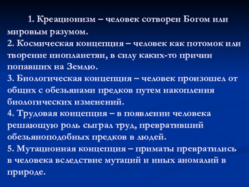 1. Креационизм – человек сотворен Богом или мировым разумом. 2. Космическая концепция – человек