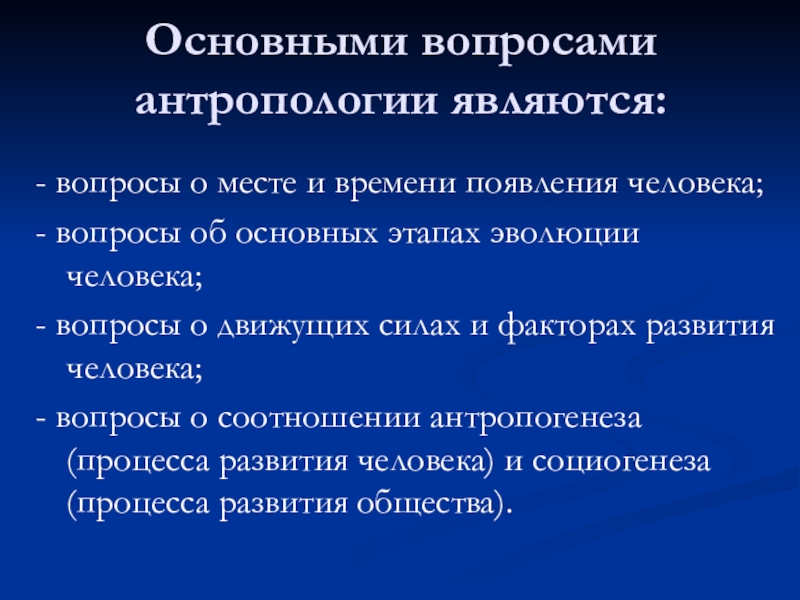 Основными вопросами антропологии являются:- вопросы о месте и времени появления человека;- вопросы об основных этапах эволюции человека;-