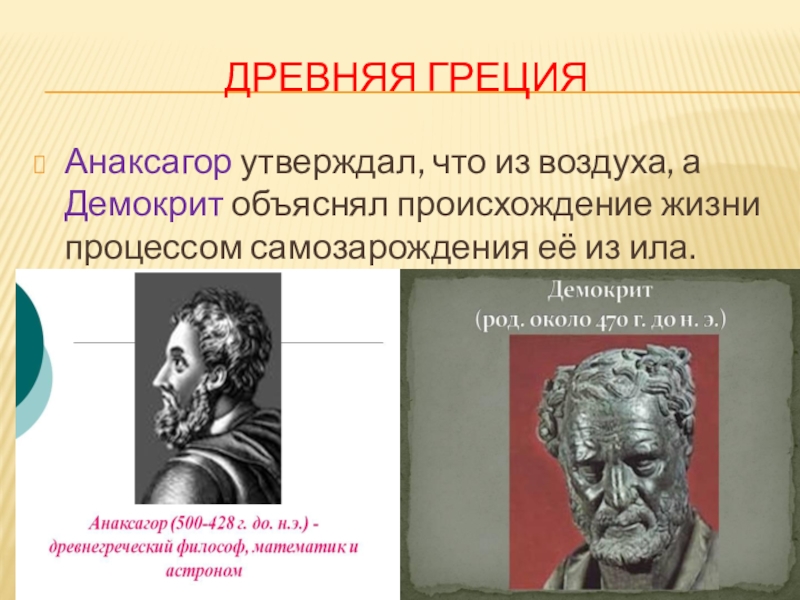 Анаксагор утверждал, что из воздуха, а Демокрит объяснял происхождение жизни