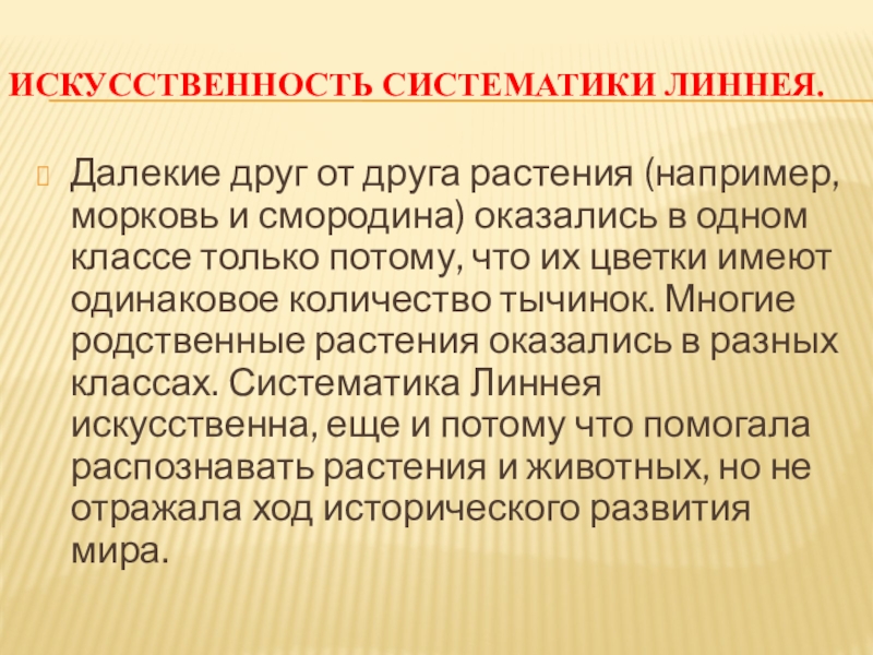 оказались в одном классе только потому, что их цветки имеют одинаковое количество тычинок. Многие родственные растения оказались в разных классах. Систематика Линнея искусственна, еще и потому что помогала распознавать растения и животных, но не отражала ход исторического развития мира.