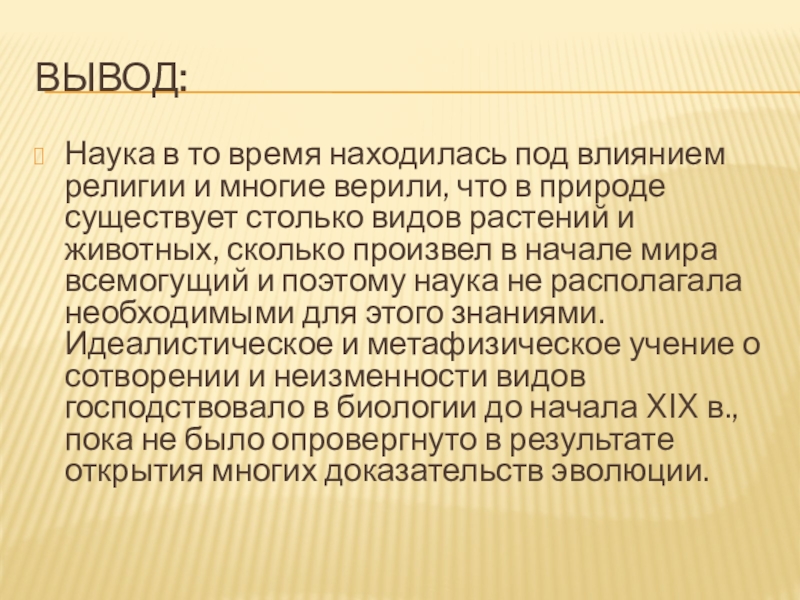 что в природе существует столько видов растений и животных, сколько произвел в начале мира всемогущий и поэтому наука не располагала необходимыми для этого знаниями. Идеалистическое и метафизическое учение о сотворении и неизменности видов господствовало в биологии до начала XIX в., пока не было опровергнуто в результате открытия многих доказательств эволюции.