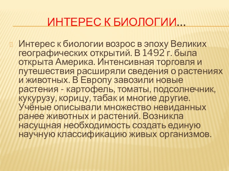 В 1492 г. была открыта Америка. Интенсивная торговля и путешествия расширяли сведения о растениях и животных. В Европу завозили новые растения - картофель, томаты, подсолнечник, кукурузу, корицу, табак и многие другие. Учёные описывали множество невиданных ранее животных и растений. Возникла насущная необходимость создать единую научную классификацию живых организмов.