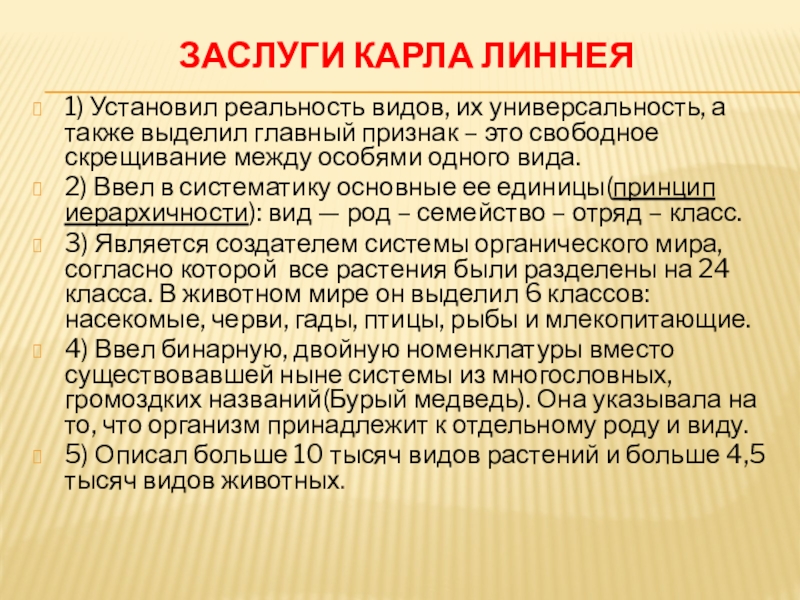 4) Ввел бинарную, двойную номенклатуры вместо существовавшей ныне системы из многословных, громоздких названий(Бурый медведь). Она указывала на то, что организм принадлежит к отдельному роду и виду.
