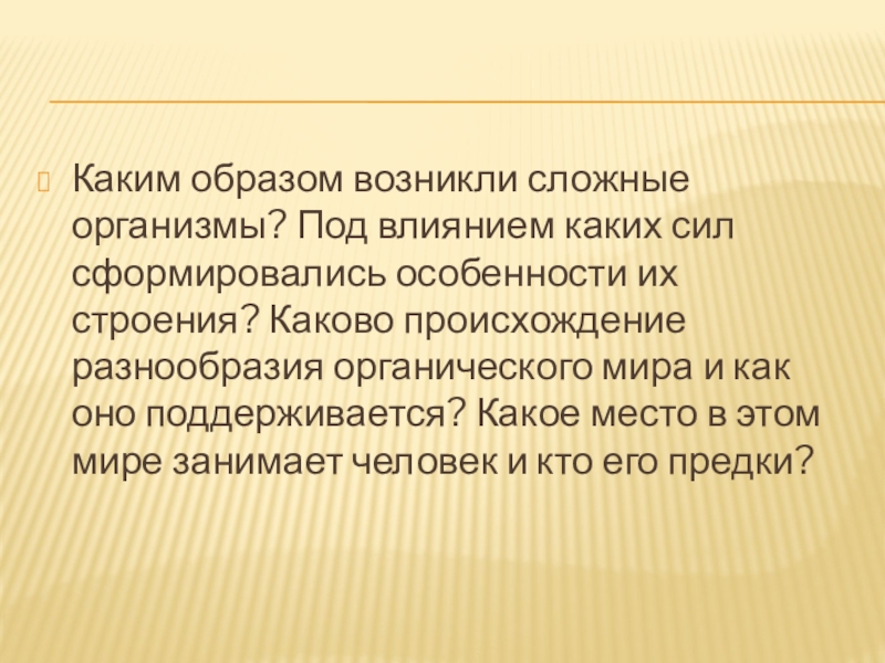 Слайд 4Каким образом возникли сложные организмы? Под влиянием каких сил сформировались особенности