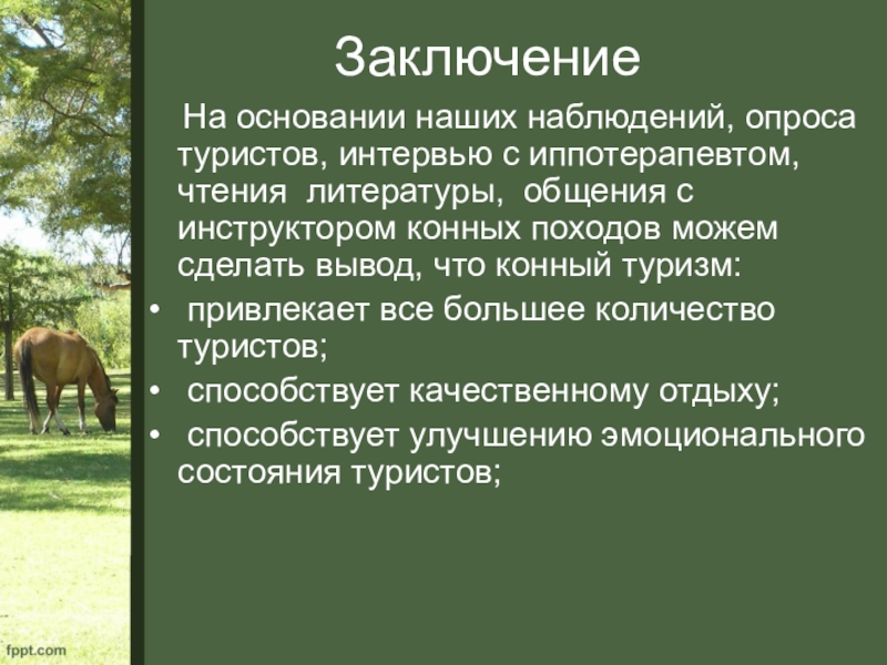 На основании наших наблюдений, опроса туристов, интервью с иппотерапевтом,