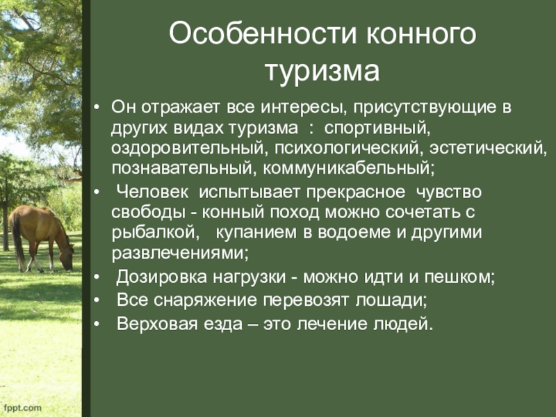 - замечательное средство физического развития, развлечения и активного отдыха. Конный спорт и конный туризм стали увлечением миллионов людей по всему миру.