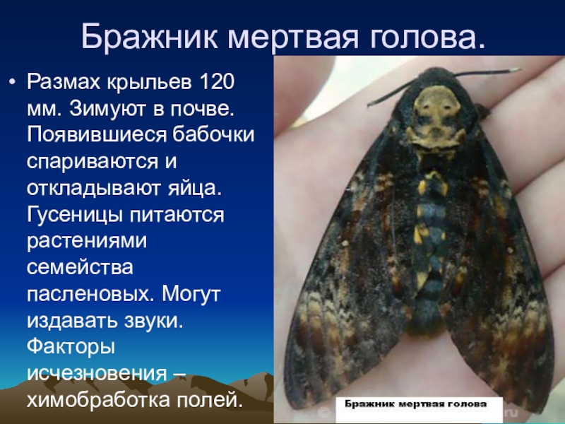 спариваются и откладывают яйца. Гусеницы питаются растениями семейства пасленовых. Могут издавать звуки. Факторы исчезновения – химобработка полей.
