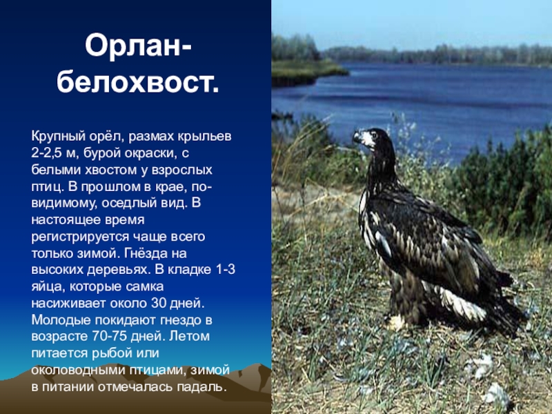 Крупный орёл, размах крыльев 2-2,5 м, бурой окраски, с белыми хвостом