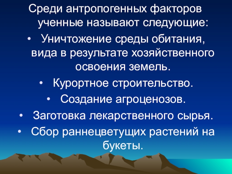 Слайд 4Среди антропогенных факторов ученные называют следующие: