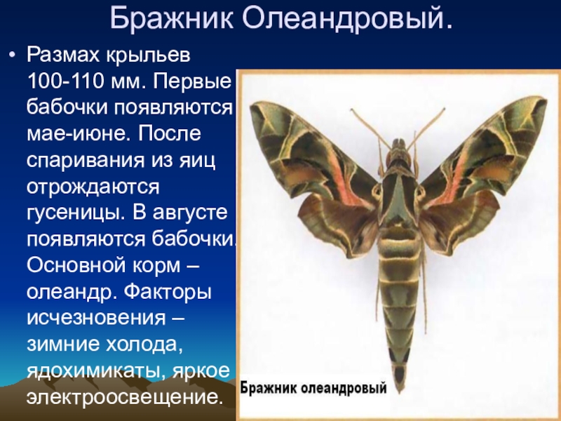 спаривания из яиц отрождаются гусеницы. В августе появляются бабочки. Основной корм – олеандр. Факторы исчезновения – зимние холода, ядохимикаты, яркое электроосвещение.