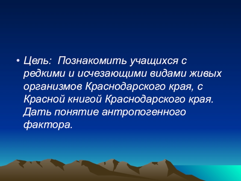 Цель: Познакомить учащихся с редкими и исчезающими видами живых организмов Краснодарского