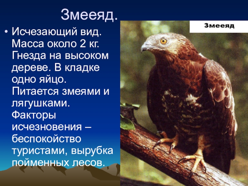 кладке одно яйцо. Питается змеями и лягушками. Факторы исчезновения – беспокойство туристами, вырубка пойменных лесов.