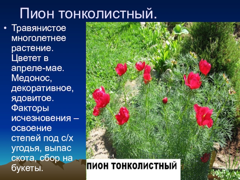 исчезновения – освоение степей под с/х угодья, выпас скота, сбор на букеты.
