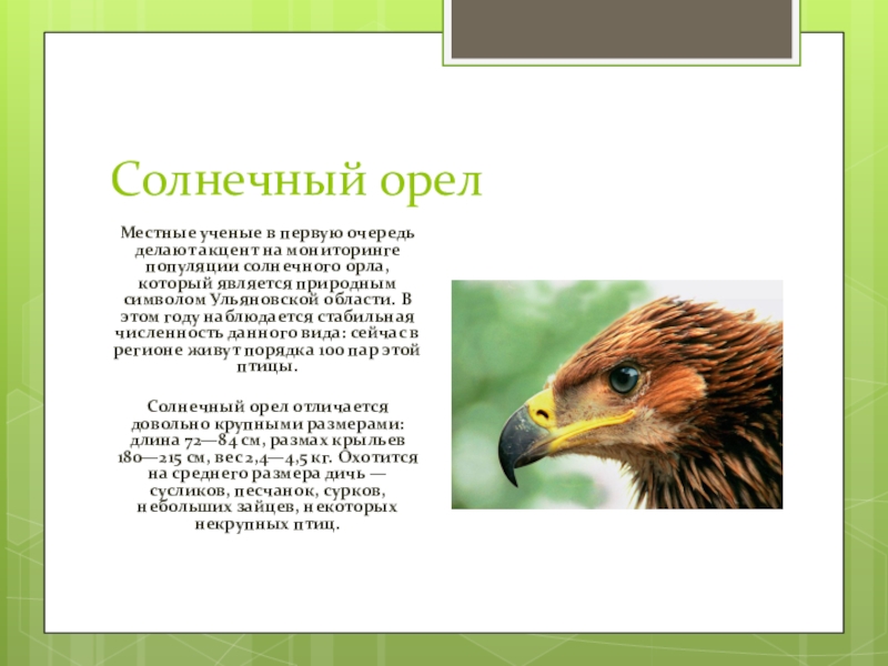 солнечного орла, который является природным символом Ульяновской области. В этом году наблюдается стабильная численность данного вида: сейчас в регионе живут порядка 100 пар этой птицы.