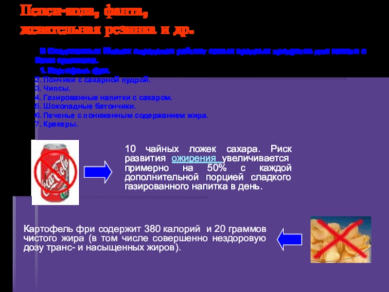 10 чайных ложек сахара. Риск развития ожирения увеличивается примерно на 50% с каждой дополнительной порцией сладкого газированного напитка в день.