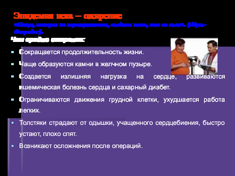Создается излишняя нагрузка на сердце, развиваются ишемическая болезнь сердца и сахарный диабет.