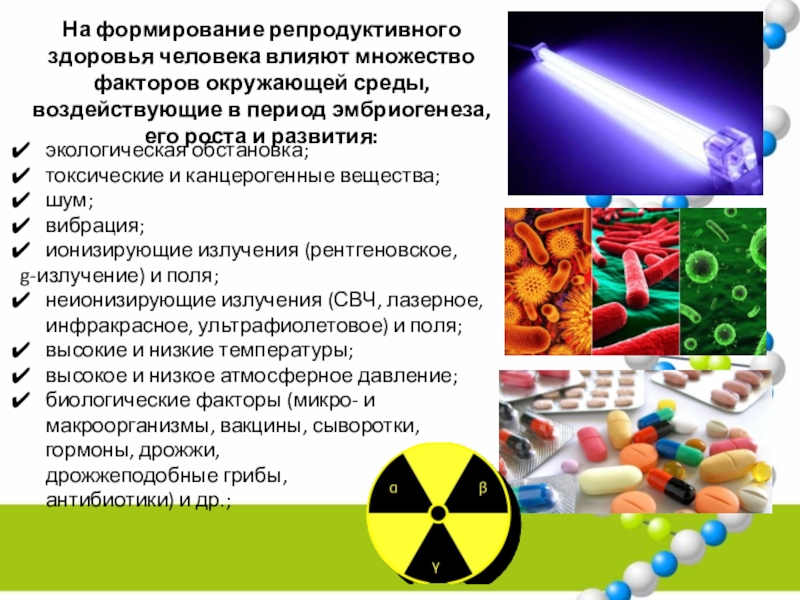 На формирование репродуктивного здоровья человека влияют множество факторов окружающей среды, воздействующие в период эмбриогенеза, его роста и развития: