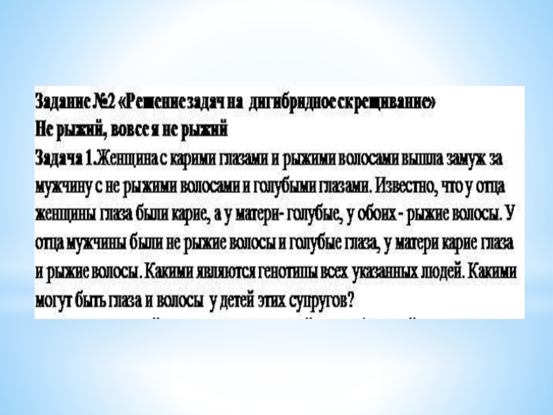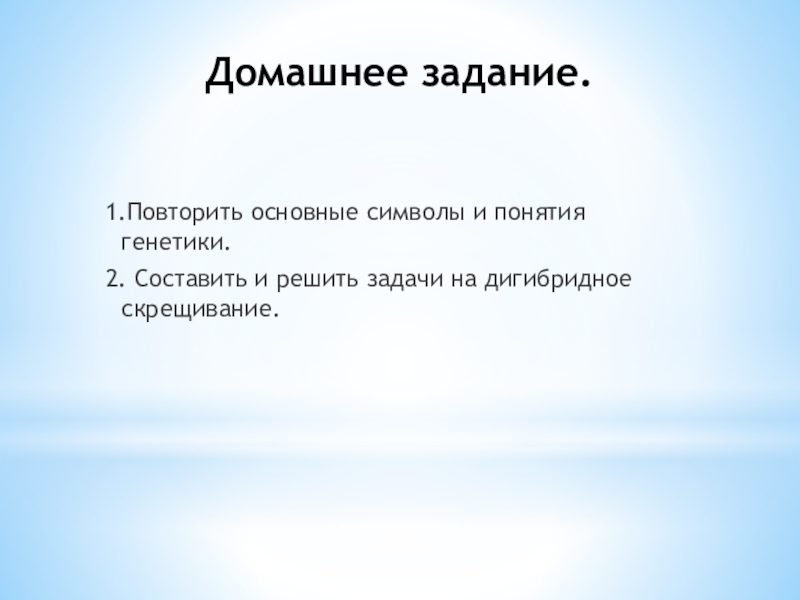 Домашнее задание.1.Повторить основные символы и понятия генетики.2. Составить и решить задачи на дигибридное скрещивание.