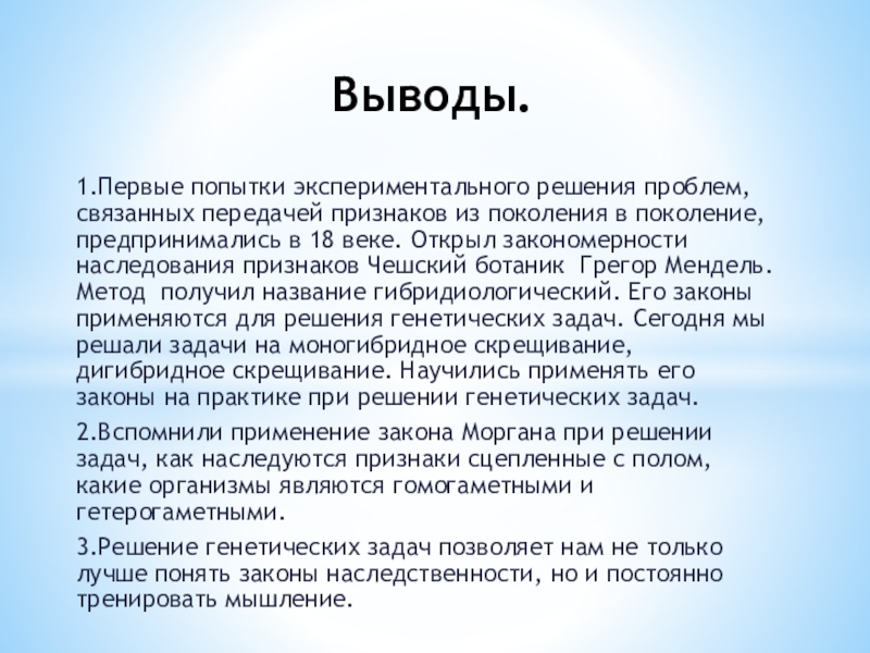 Выводы.1.Первые попытки экспериментального решения проблем, связанных передачей признаков из поколения в поколение, предпринимались в 18 веке. Открыл