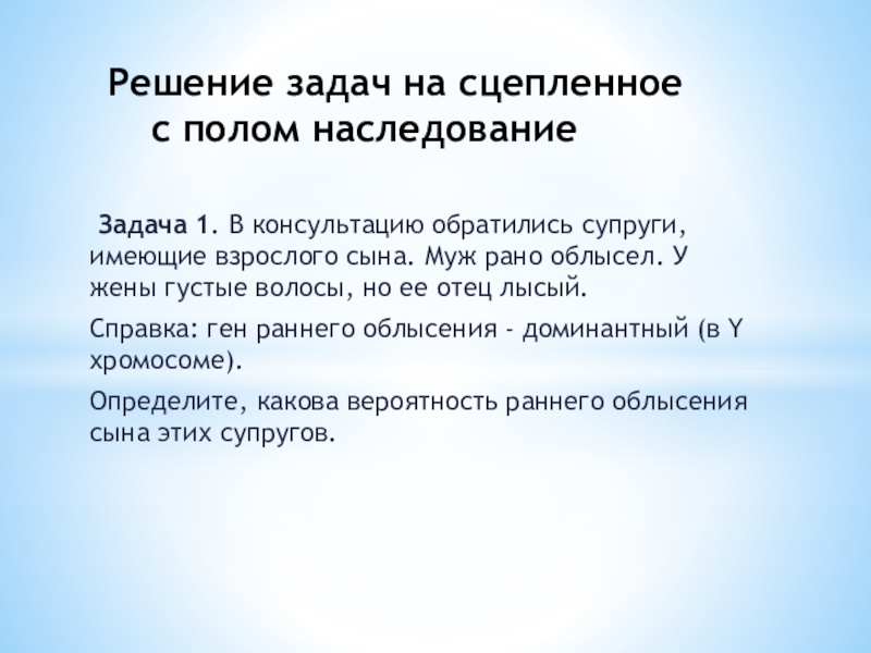 обратились супруги, имеющие взрослого сына. Муж рано облысел. У жены густые волосы, но ее отец лысый.