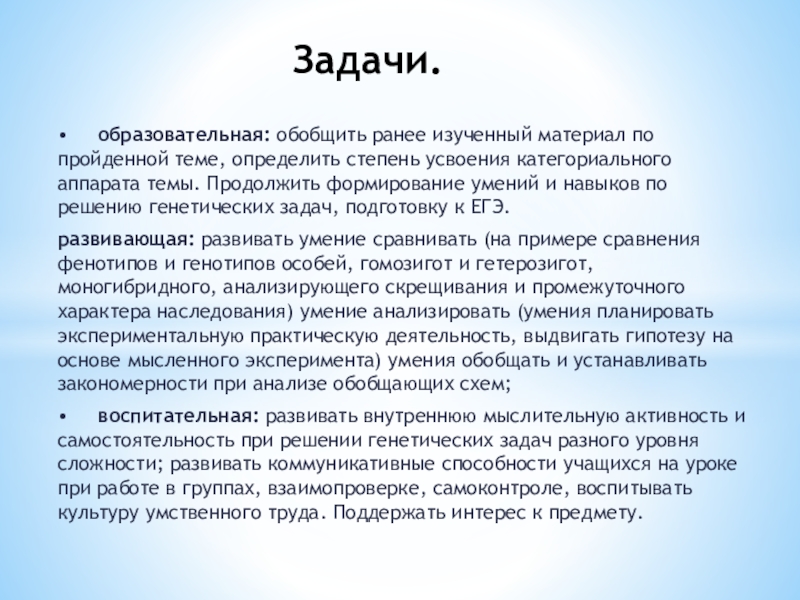 • воспитательная: развивать внутреннюю мыслительную активность и самостоятельность при решении генетических задач разного уровня сложности; развивать коммуникативные способности учащихся на уроке при работе в группах, взаимопроверке, самоконтроле, воспитывать культуру умственного труда. Поддержать интерес к предмету.