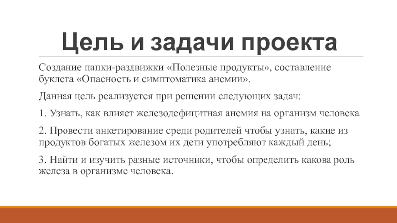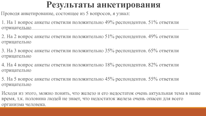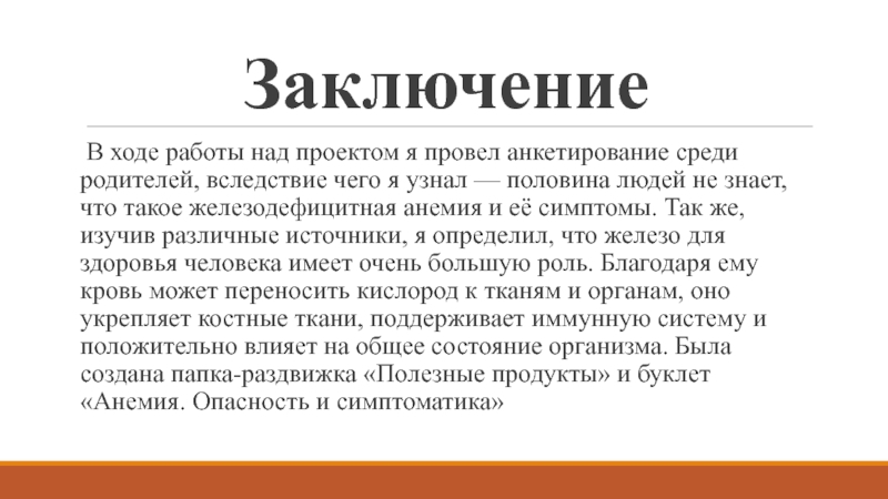 вследствие чего я узнал — половина людей не знает, что такое железодефицитная анемия и её симптомы. Так же, изучив различные источники, я определил, что железо для здоровья человека имеет очень большую роль. Благодаря ему кровь может переносить кислород к тканям и органам, оно укрепляет костные ткани, поддерживает иммунную систему и положительно влияет на общее состояние организма. Была создана папка-раздвижка «Полезные продукты» и буклет «Анемия. Опасность и симптоматика»