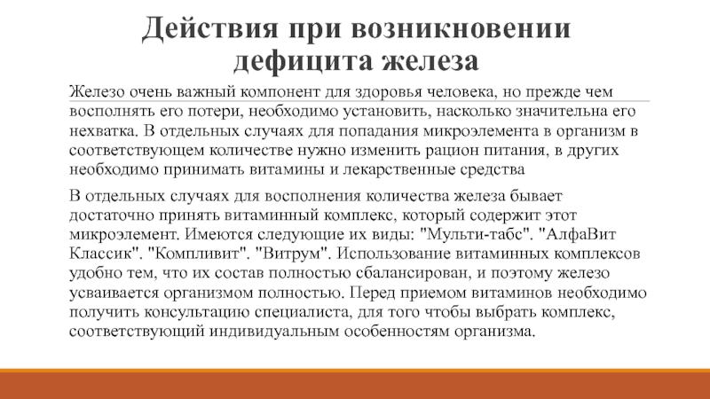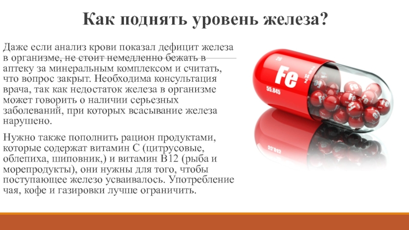 но прежде чем восполнять его потери, необходимо установить, насколько значительна его нехватка. В отдельных случаях для попадания микроэлемента в организм в соответствующем количестве нужно изменить рацион питания, в других необходимо принимать витамины и лекарственные средства