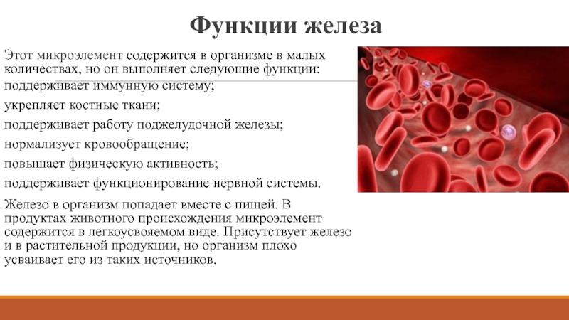 Железо в организм попадает вместе с пищей. В продуктах животного происхождения микроэлемент содержится в легкоусвояемом виде. Присутствует железо и в растительной продукции, но организм плохо усваивает его из таких источников.