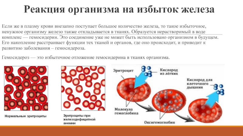 большое количество железа, то такое избыточное, ненужное организму железо также откладывается в тканях. Образуется нерастворимый в воде комплекс — гемосидерин. Это соединение уже не может быть использовано организмом в будущем. Его накопление расстраивает функции тех тканей и органов, где оно происходит, и приводит к развитию заболевания – гемосидероза.